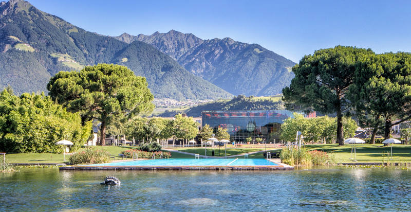 Trascorri una giornata di wellness alle Terme Merano, troverai un immenso paradiso acquatico e un magnifico parco termale su 52.000 m2, con 10 piscine esterne immerse tra alberi secolari, roseti, prati ed un laghetto delle ninfee (da maggio a settembre)