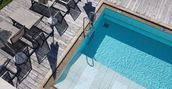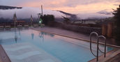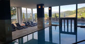 Zona piscina con vasca interna, vasca esterna riscaldata, lettini idromassaggio con vista