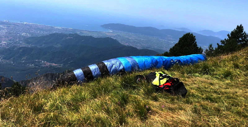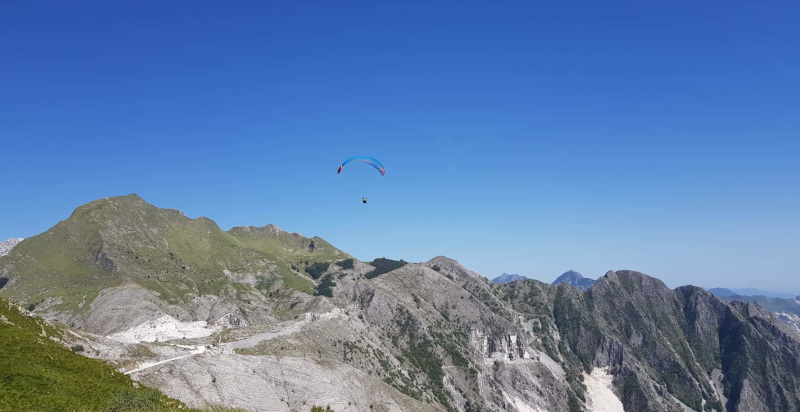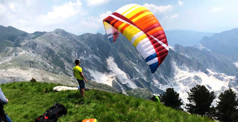 Volo in parapendio in Toscana sopra il parco delle Alpi Apuane. Il volo con decollo da Campocecina, posto a 1200 metri s.l.m., offre un panorama a 360° lungo il litorale della Versilia, il golfo di La Spezia fino alla città di Livorno.